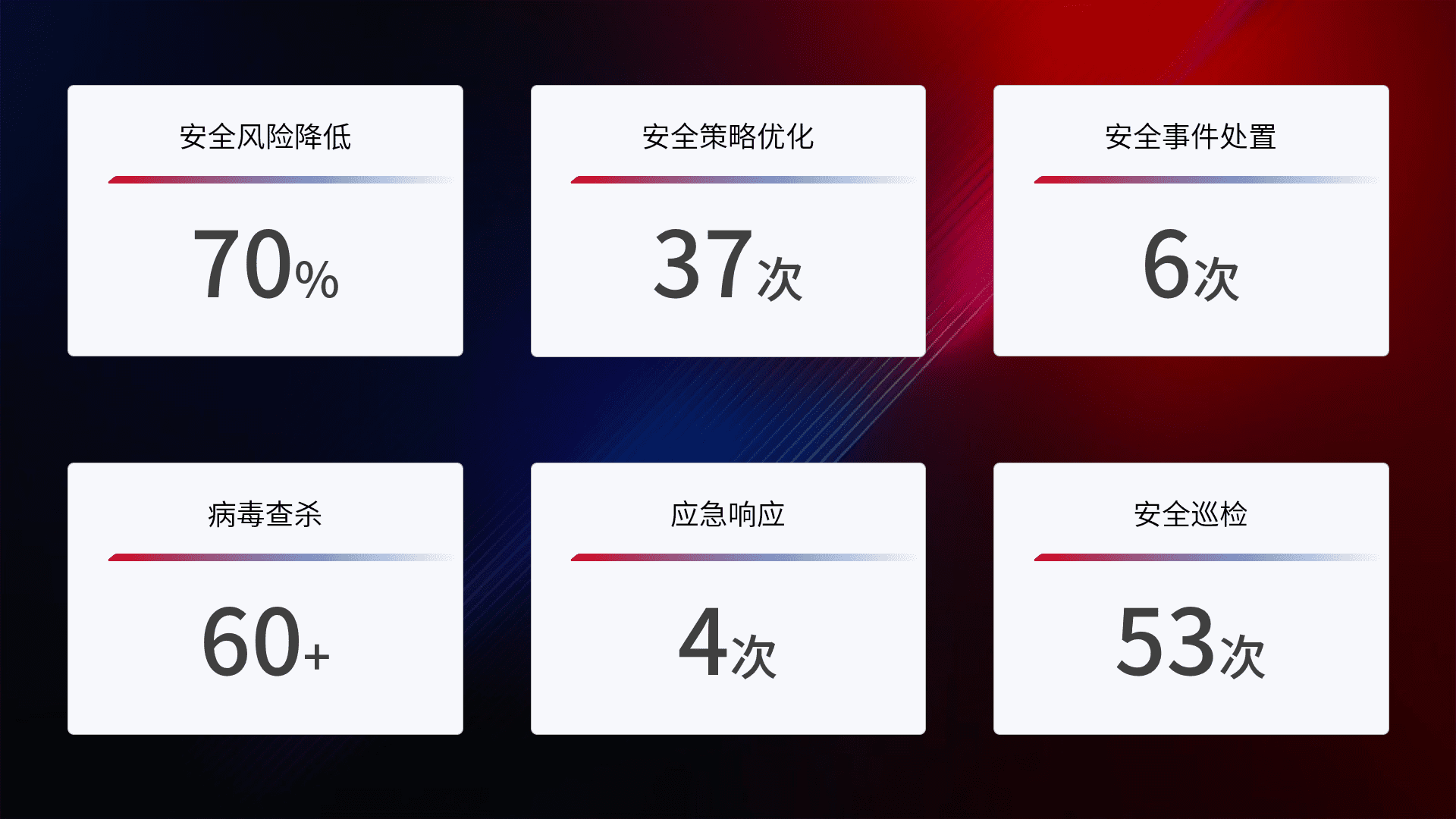 提供全面的安全事件报告体系,,,包括处置报告、、、周报、、、、季度和年度总结,,,结合持续监控,,帮助客户深入了解网络安全状况。。。