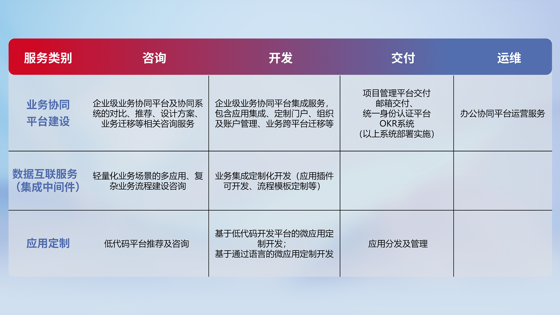 针对钉钉、、、、企微、、IDaas等平台级产品提供产品的规划、、、、方案、、、交付、、、定制化开发等服务,,,,实现如统一协同办公、、智能客户服务、、、混合会议管理、、、、智能数据查询、、等业务场景,,,实现数字化转型。。。